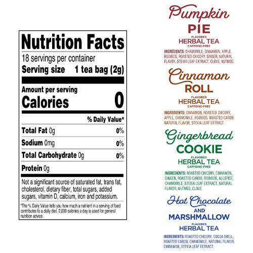 Chamomile, Cinnamon, Apple, Rooibos, Roasted Chicory, Ginger, Natural Flavor, Stevia Leaf Extract, Clove, Nutmeg.
