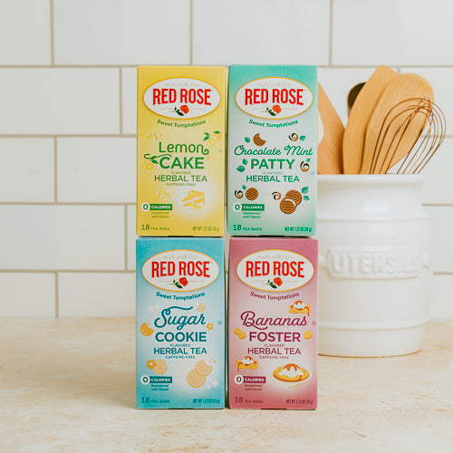 We made a new bundle of four of our top selling Red Rose Sweet Temptations items! Enjoy our newest flavor: Chocolate Mint Patty, along with Sugar Cookie, Bananas Foster and everyone's favorite, Lemon Cake!