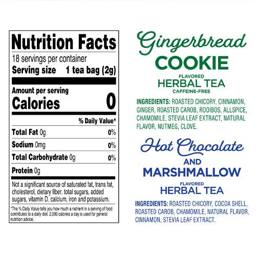 Roasted Chicory, Cinnamon, Ginger, Roasted Carob, Rooibos, Allspice, Chamomile, Stevia, Natural Flavor, Nutmeg, Clove.